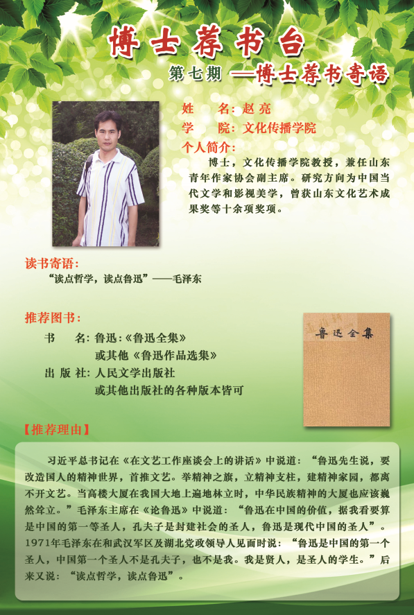 十一届“读者服务月”博士教师为师生荐书 作者: 编辑: 复审: 终审: 来源: 发布时间:2016-11-22 腹有诗书气自华,最是书香能致远。第十一届“读者服务月”之际,图书馆邀请了八位博士教师为大家推荐优秀书籍。八位博士教师来自不同的学院,有着不同的审美意趣、人生阅历,但相同的是都有着一颗热爱阅读的心。他们以八种阅读风格,八种读书方式,展示各自在书籍中翱翔的精神世界。