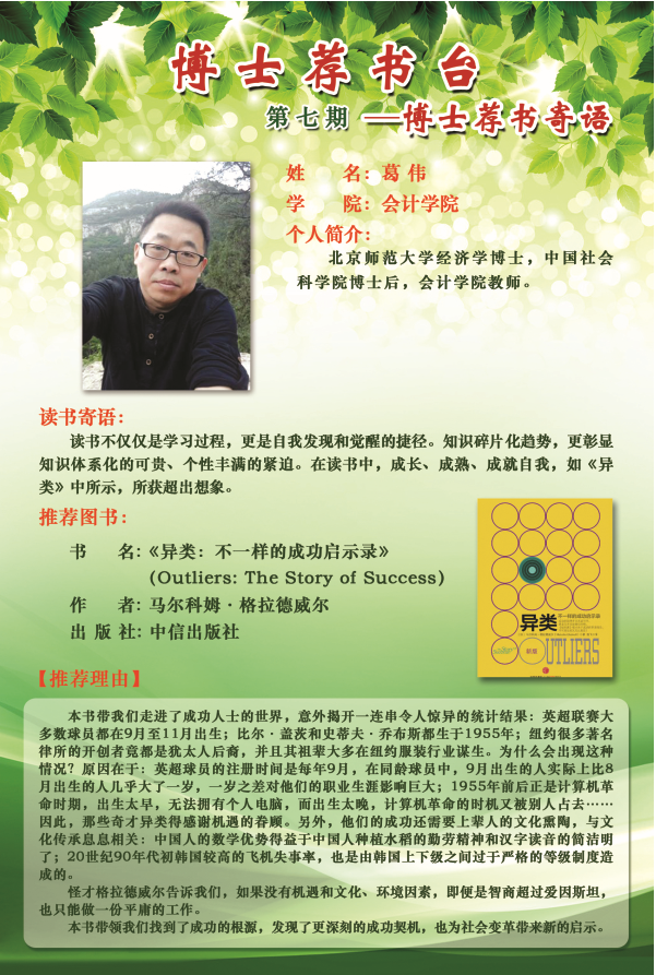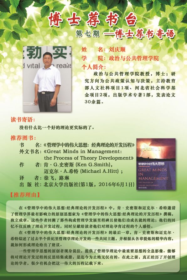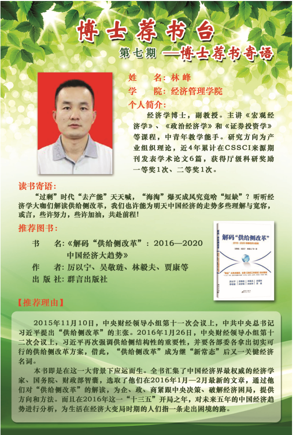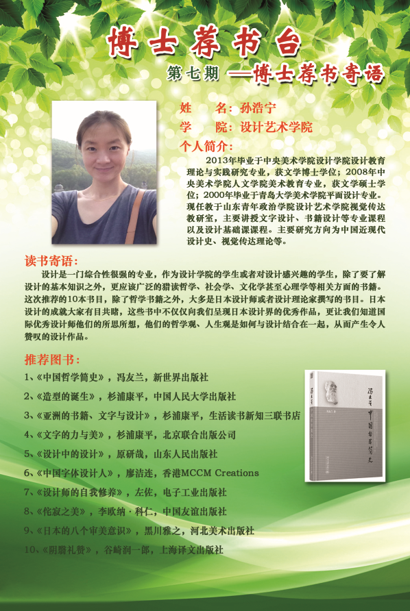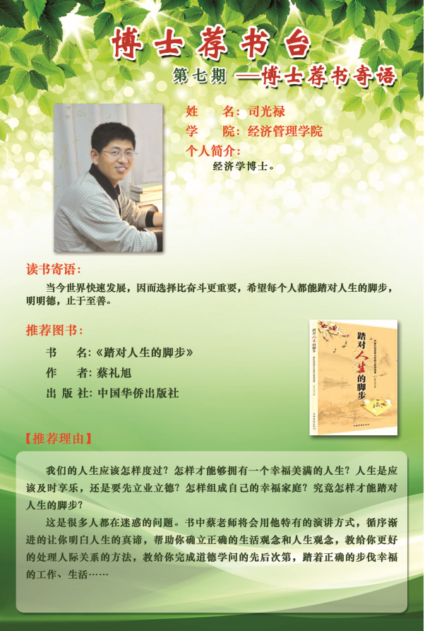 腹有诗书气自华,最是书香能致远。第十一届“读者服务月”之际,图书馆邀请了八位博士教师为大家推荐优秀书籍。八位博士教师来自不同的学院,有着不同的审美意趣、人生阅历,但相同的是都有着一颗热爱阅读的心。他们以八种阅读风格,八种读书方式,展示各自在书籍中翱翔的精神世界。