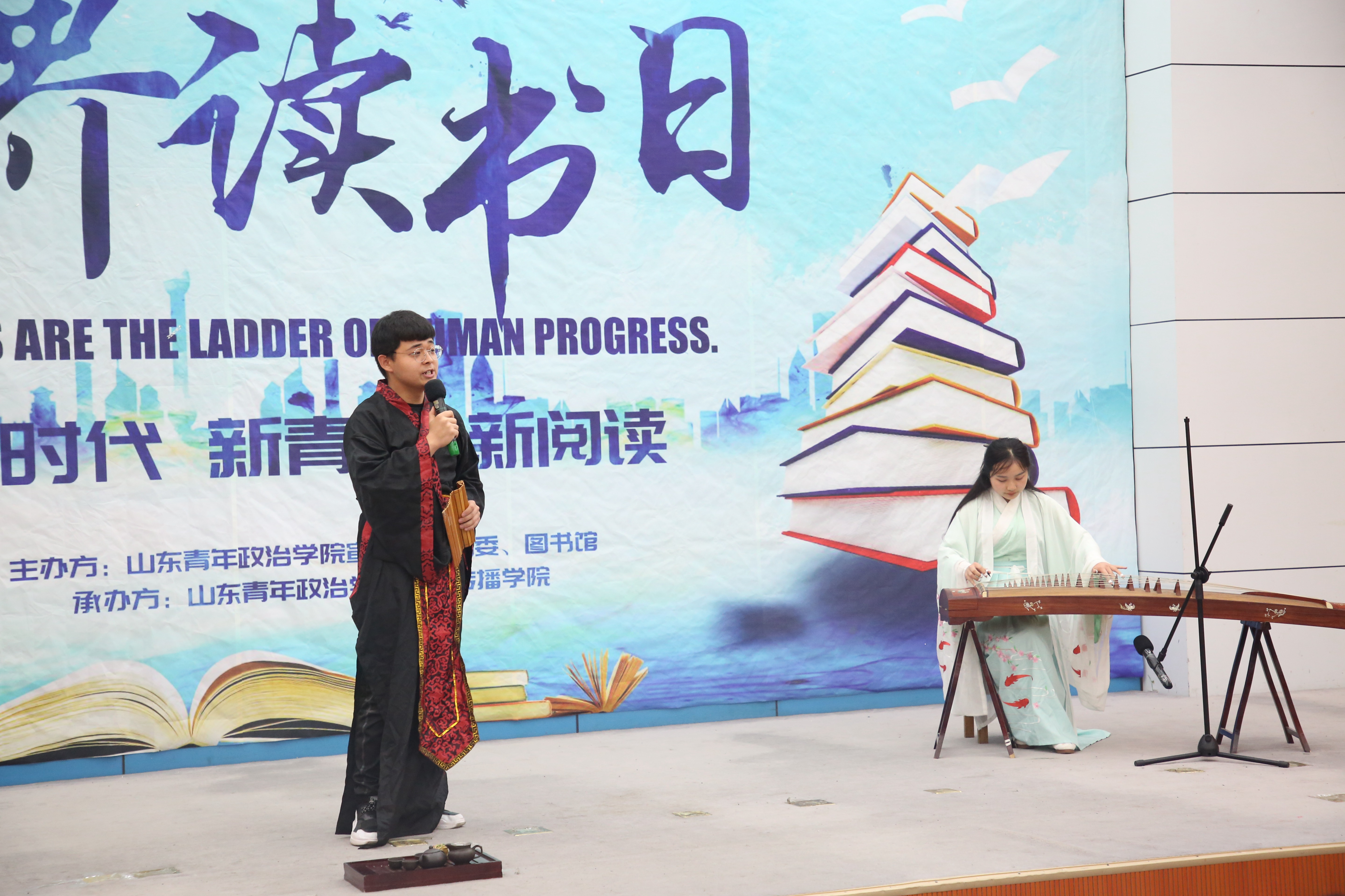 在文化传播学院学生赵正浩、石潇懿的古筝配乐朗诵后,学生代表姚欣瑜发言提到,书籍是人类的食粮,是人类进步的阶梯,并呼吁大家积极响应读书月系列活动,尽情享受读书的浓浓乐趣。