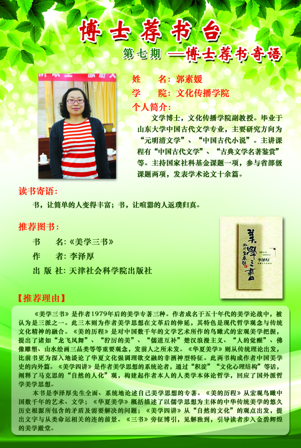 腹有诗书气自华,最是书香能致远。第十一届“读者服务月”之际,图书馆邀请了八位博士教师为大家推荐优秀书籍。八位博士教师来自不同的学院,有着不同的审美意趣、人生阅历,但相同的是都有着一颗热爱阅读的心。他们以八种阅读风格,八种读书方式,展示各自在书籍中翱翔的精神世界。