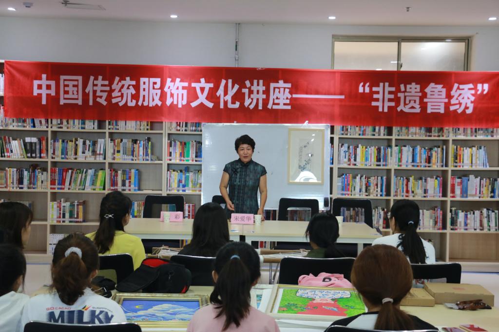 图书馆创新学科服务模式,重点放在“为教学服务,为专业和课程服务”上面,将现场教学搬进了图书馆,邀请到了山东省博物馆鲁绣研究中心负责人、山东省工艺美术大师“鲁绣传承人”宋爱华讲述鲁绣文化知识并现场展示刺绣手工艺。设计艺术学院副院长徐彩,服装与服饰设计教研室全体教师、图书馆学术研究中心馆员以及设计艺术学院2019级服装与服饰设计专业全体学生参加了此次讲座。