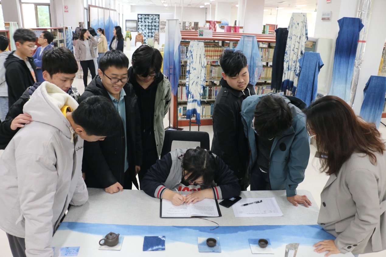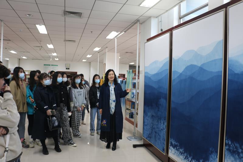 吴慧荣耐心地为众多参观者详细介绍了草木染的历史文化及作品创作过程,并与他们进行了深入交流探讨。参观者纷纷留言,给予展览高度评价,其中来自烟台的设计师田春梅这样写道:“今日有幸近距离观看吴老师的植物染展,兴奋之情无法用语言表达。通过视觉、触觉、远观、近赏,真实地体验到植物染的美,惊叹于艺术与自然的无穷魅力!感谢学校给我们一次美的视觉享受。”来自山东工艺美院的崔教授说:“草木染作品在图书馆中展出,环境优雅,靛蓝悠远,大作《山青青》更是蓬勃大气,此作品正符合学校的校名与气质,天作之合!”来自齐鲁工大的硕士研究生留言道:“染草木发乎韵,蕴桃李出于蓝。”来自我校设计艺术学院的朱国芳博士说:“展览的草木染作品留下了自然和手作的记忆,我想如果没有宁静的心境怕是不能染出这样安然干净的作品来。”山东轻工职院的聂老师说:“这是一场有温度的展览,草木与书香的完美结合,让人流连忘返的视觉盛宴!”