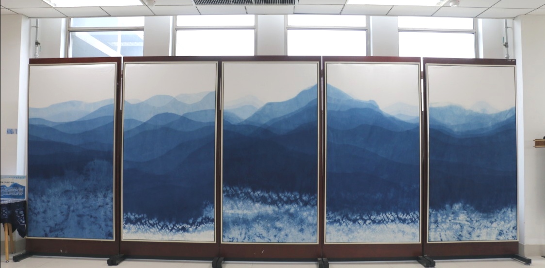 蓝染壁画《山青青》作为本次展览的代表作品之一,凝聚着作者吴慧荣对我校的无比热爱和美好祝福之情。《荀子·劝学》中指出:“青,取之于蓝,而青于蓝。”意思是:靛青这种染料,是从蓝草中提取的,但它的颜色比蓝草更青。世人比喻那些在学业上有所建树的后起之秀。《山青青》这幅作品,就是采用靛蓝古法染色技艺,同时采用传统扎染及吊染的处理方法,反复染色达数十遍之多,使作品呈现出山峦叠嶂,绵延起伏的气势。在山脚下扎染出了满园盛开的桃花,寓意我校桃李满天下,学子们学有所成,前程锦绣,青出于蓝而胜于蓝。