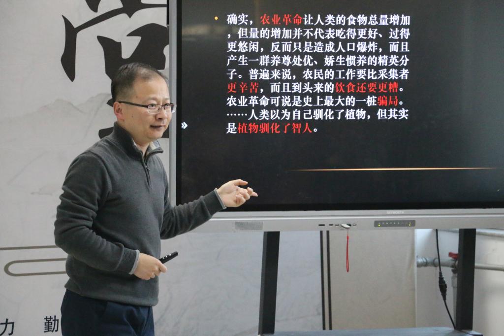 讲座一开始,张振先用幽默风趣的语言激发同学们的好奇心,轻松引入了一个个哲学问题:我们更快乐了吗?我们的明天会更好吗?并将这些问题贯穿整个讲座,使同学们深入思考了解人类社会的发展历程和发展模式,与2000年前的庄子进行了一场跨越时空的交流对话。讲座过程中,同学们被张振形象生动的表达所吸引,将生活中的小问题与《庄子》时时碰撞,用别具风格的方式阐明了本次讲座的主旨,彰显出了《庄子》的智慧和价值,引领青年学子走进历史,认识历史,感悟历史。讲座赢得了同学们的阵阵掌声。