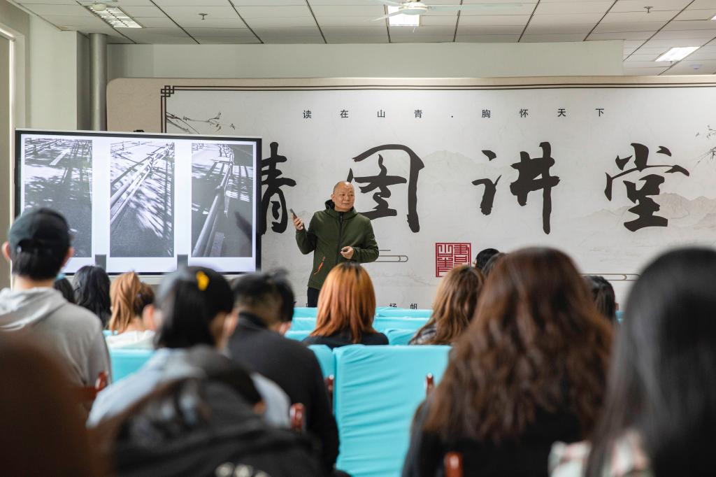 4月15日下午3点,“青图讲堂”第十四期在图书馆五楼工具书特藏阅览厅开讲。本期主讲内容为摄影——更清晰地接近生活。主讲人为我校设计艺术学院教授周云飞。