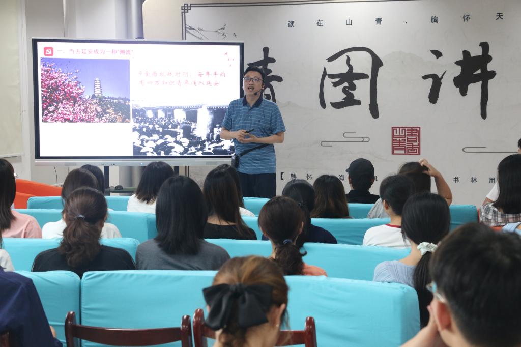 9月16日下午3点,我校图书馆联合校团委共同举办的“青图讲堂”第二十五期在图书馆五楼工具书特藏阅览厅如期开讲。本次讲座的主讲人是中国作家协会会员、山东省青联委员、山东省新阶层联理事张嵚。讲座的题目是:那些年,为什么有那么多青年去延安?
