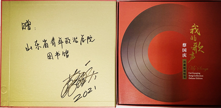 10月19日,中国歌唱艺术家、全国青联常委、中国音乐家协会理事、国家一级演员、中央军委政治工作部歌舞团歌唱家、山东青年政治学院特聘教授蔡国庆做客山青“舞苑讲坛”,并向图书馆捐赠珍藏版演唱专辑《我的歌声》和个人著作《龙骧:蔡国庆的收藏主义》。