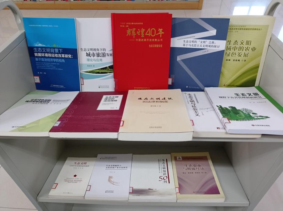 本次主题书展挑选生态文明相关图书39种(共50余册)在图书借阅厅展出,图书内容涵盖广泛,包含政治、哲学、经济、环境科学等类别,旨在让同学们从多方面、多角度了解生态文明,欢迎广大读者前来借阅。