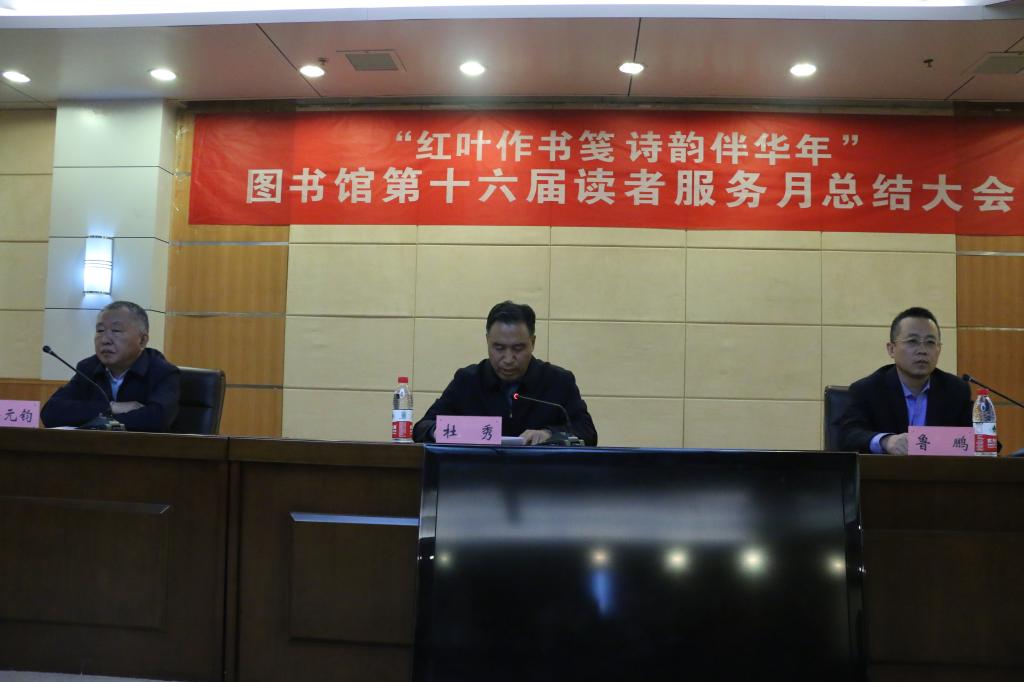 12月9日下午,图书馆第十六届“读者服务月”总结大会在图书馆学术会议厅隆重召开。馆长杜秀,副馆长鲁鹏、牟元军出席了本次活动,图书馆各科室负责人和读者代表参加了活动,活动由鲁鹏主持。