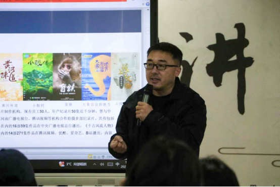 随后,海导演着重讲解了其广受好评的纪录片《千古风流人物》。该片记录了李白、杜甫、陆游、白居易、李清照、陶渊明等文化名人的生平,通过实地取景、情景再现、手绘动画与三维特效等多元手段,生动还原了他们的人生轨迹。海导演生动讲解了纪录片从选题构思到拍摄画面、运镜技巧的全过程。他指出影片的成功之处在于,它以历史事件为脉络,结合主人公的经典作品与时代背景,深入挖掘了他们作为普通人的情感与困境,让历史人物变得有血有肉,可亲可感。这种创作方式也获得了大众的热烈反响,在豆瓣网上斩获9分以上的高分,证明了这种叙事方式的强大魅力。