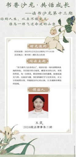 12月25日,书香沙龙・共话成长活动第十三期在图书馆二楼红色文化馆温情启幕,三十余名“寻山人”齐聚一堂,在主讲人王岚的引领下,共同走进《你当像鸟飞往你的山》的文字世界。