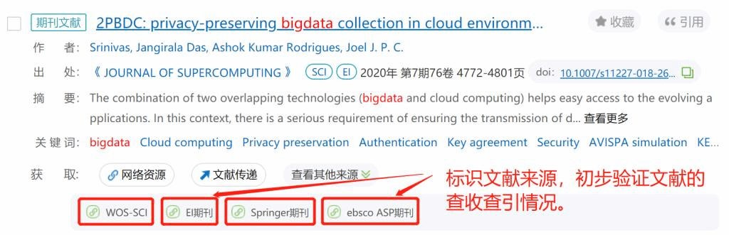经纶对文献的数据来源进行过标引,标识出文献是否来源于中文核心、SCI、EI、Springer、EBSCO。点击来源链接,跳转到来源网站的详情页面,可以初步验证某篇文章的查收查引情况。