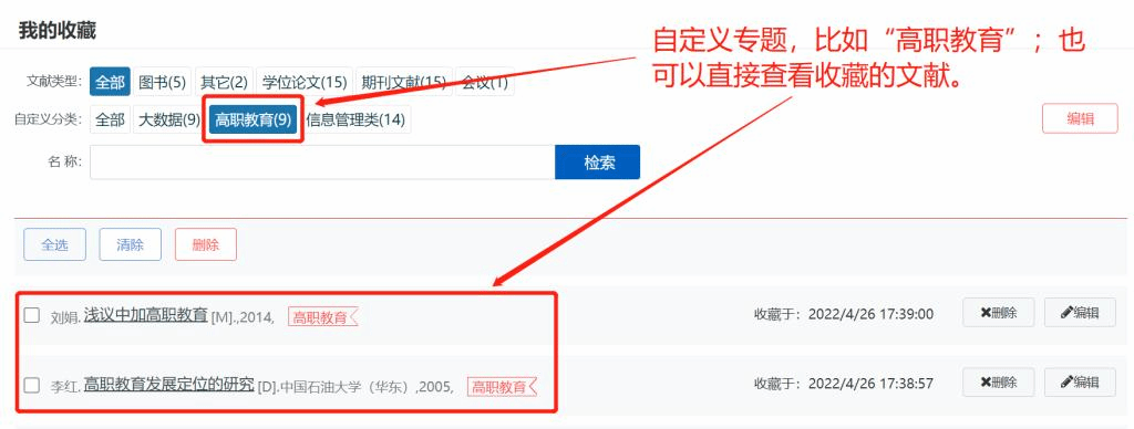 用户对不同类型的文献进行收藏后,资源可自行分类保存到“个人中心”,可随时进行查看、浏览、原文获取。