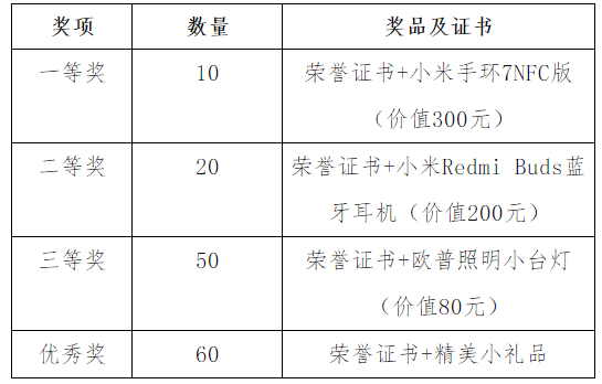 6.根据答题排名设置奖项,其中设学生奖项:一等奖10名,二等奖20名,三等奖50名,优秀奖60名;设优秀组织奖5名。