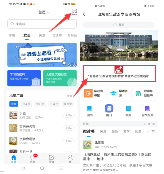 3.学习通右上角输入邀请码:sdqnzzxy,进入首页,找到“‘超星杯’山东省高校图书馆‘齐鲁文化知识竞赛’”栏目。