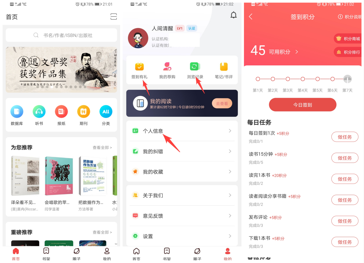 【个人中心】点击我的可以进入个人中心,完善个人信息查看浏览记录及签到有礼等功能