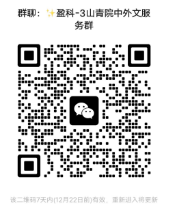 请群内的各位老师于2025年12月22日前,扫描下方二维码加入“盈科-2山青院中外文服务群”或“盈科-3山青院中外文服务群”,其服务内容与原群一致。