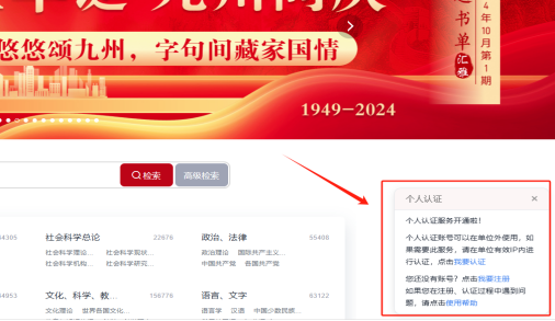 在校园网IP范围内登陆后,可根据汇雅首页右下角弹出的提示信息进行个人认证,完成认证后,则可在IP范围外通过个人账号进行登录。